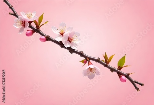 Cherry blossom branch with pink flowers on a plain background