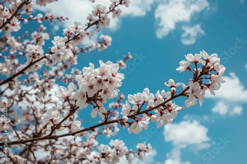 Cherry blossom branches adorned with flowers set against a cloudy blue sky. Nature backdrop with ample copy space. High resolution image.