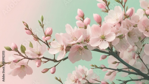 Cherry blossom branches bloom with delicate pink flowers set against a soft pastel background