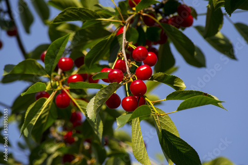 cherry branch with red juicy fruits and green leaves.