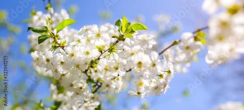 Cherry plum tree blossom. Blooming tree branch on the sunny spring day. Real natural photo on the blue sky background. Spring concept.