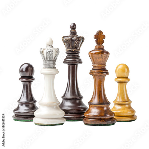 Chess pieces stand together against a white backdrop ready for strategy game.