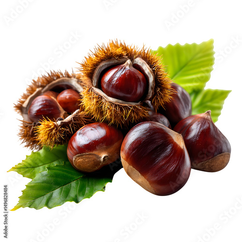 Chestnuts in shiny brown shells with prickly outer husks, some peeled to reveal the nut, fresh green leaves included, isolated on white