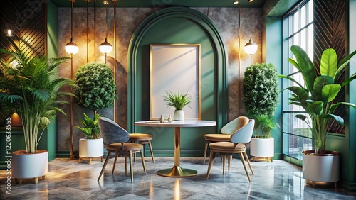 Chic Boutique Cafe Interior: Marble Floor, Round Table, Vertical Poster