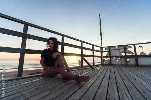 Chica guapa posando en balcon de madera al atardecer en Cadiz