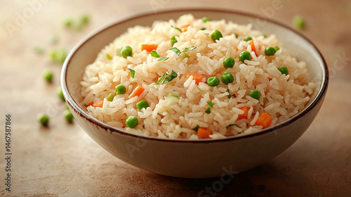 Chicken and egg fried rice with carrots and green peas served in a bowl. A colorful, healthy meal symbolizing balance, comfort, and nourishment in a wholesome Asian-inspired dish.