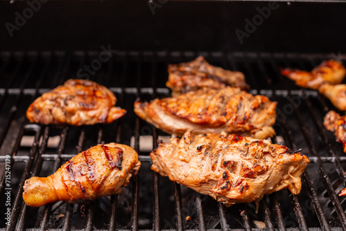 chicken cooking on barbecue flame grill
