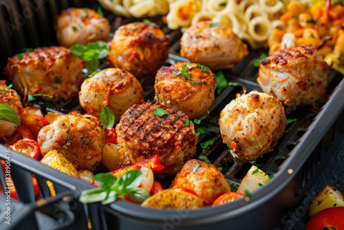 Chicken meatballs with pasta and vegetables cooking in an air fryer