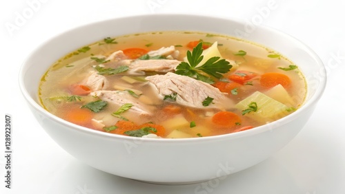 soup, chicken, broth, vegetable, carrot, potato, parsley, herb, garnish, food, cookery, dish, bowl, white, background, isolated, studio, shot, photo, image, culinary, healthy, meal, diet, ingredient, cooking, receipe, delicious, tasty, hot, warm, comfort, plate, clean, simple, appetising, dinner, lunch, protein, home, style