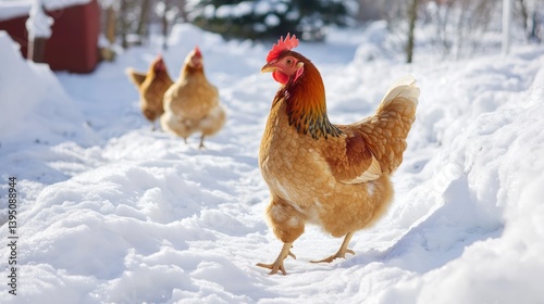 Chicken walking on eco-friendly poultry farm in wintertime snowy landscape