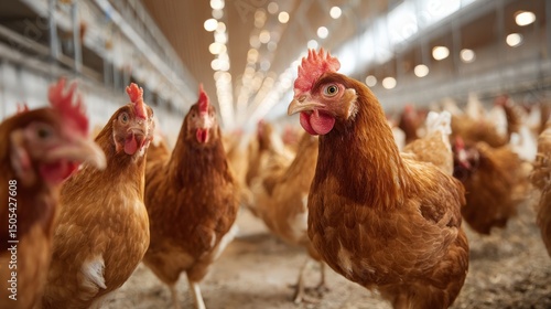 Chickens gathered inside a large, well-lit poultry farm, standing on straw-covered ground.