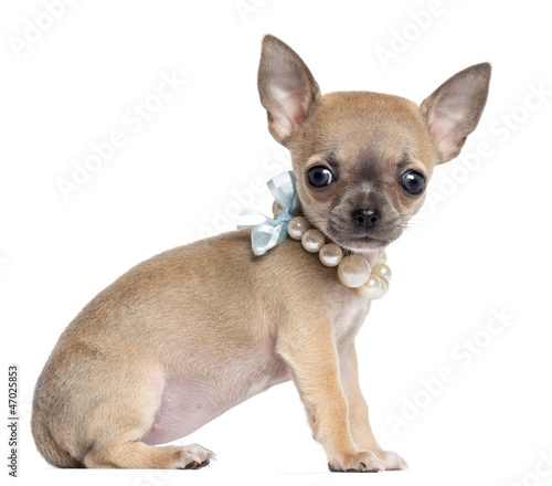 Chihuahua puppy, 4 months old, wearing pearl necklace