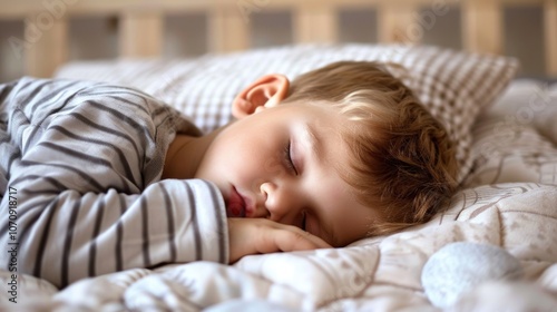 Child Asleep In Bed. Adorable Caucasian Boy Dreaming Peacefully Under Soft Bedclothes
