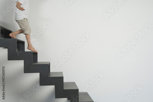 Child barefoot walking down modern staircase with minimalist background