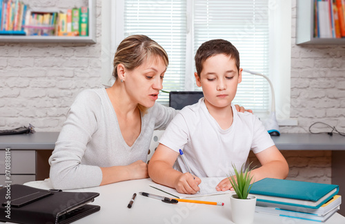 home, tutor, isolation, online, children, boy, student, woman, eltern, family, mother, freelance, schooling, learning, teacher, teaching, studying, education, educate, educator, mentor, training, train, instructor, lecturer, homework, job, work, working, remote, distance, domestic life, workplace, wireless technology, device, desktop pc, laptop, togetherness, communication, epidemic, quarantine, teenage, back to school, helping, childcare center, nurse