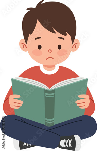 Child engrossed in reading a book with a worried expression vector art