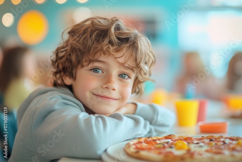 Child enjoys making a pastel themed DIY pizza with friends in a bright cafe setting