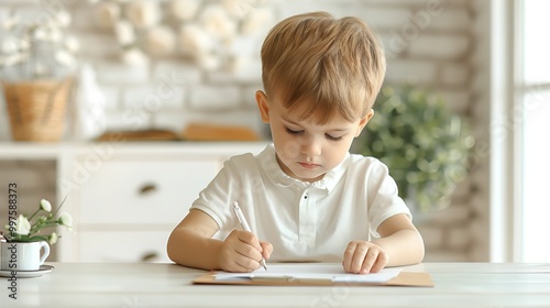 Child focused on drawing at a table, bright and inviting indoor environment.