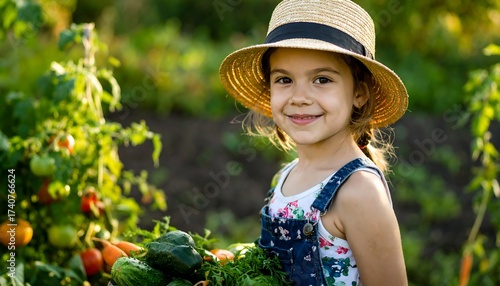 girl, garden, gardening, harvest, vegetable, children, straw, hat, cute, smile, outdoors, summer, plant, tomatoes, carrot, cucumber, nature, sunlight, overall, children