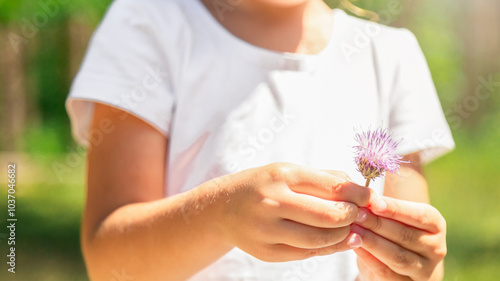 Child girl walking in park outdoor enjoying summer flowers family lifestyle vacations kid 4 years old. portrait little girl in harmony with nature