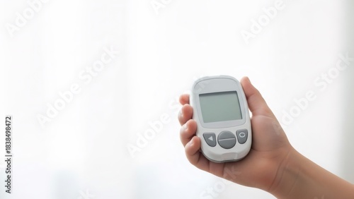 Child hand holding a glucometer. Daily blood sugar monitoring for diabetes management. Medical device for health care.