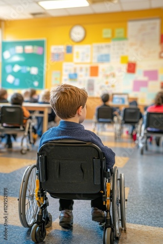 classroom, children, wheelchair, student, school, lesson, education, learning, sitting, back, view, boy, young, wall, poster, chart, notice, information, display, decoration, furniture, floor, wheel, chair, mobility, assistance, setting, group, children, rear