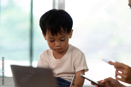 Child learning financial literacy. Young boy focused on writing in notebook.