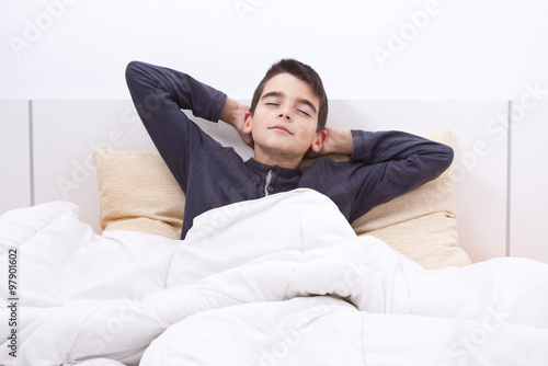 sleep, bed, sleeping, yawning, lying, room, bedchamber, interior, mattress, home, comfortable, convenient, lifestyle, happy, smiling, waking, early, night, morning, resting, couch, blanket, sheet, bedding, children, young, children, caucasian, charming, expression, arousing, latin, supported, posture, happiness