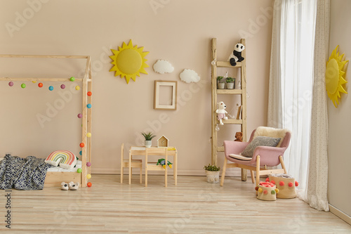 Child room concept with wooden furniture design, bed cabinet and toy.