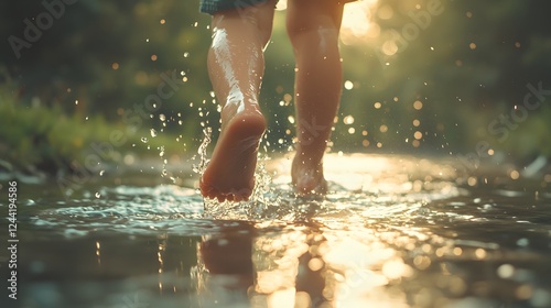 Child running barefoot through water. Child splashing in puddle during golden hour droplets sparkling in sunlight. Carefree play on Step in a Puddle and Splash Your Friends Day