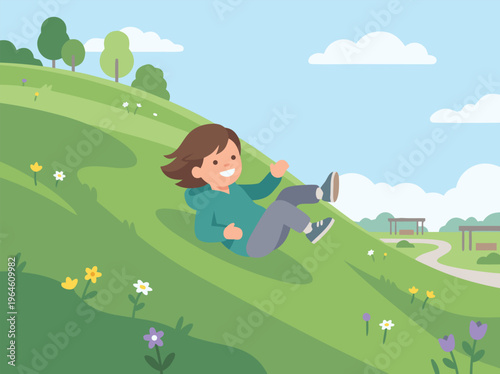 children, girl, children, young, childhood, play, playing, fun, joy, happy, smiling, laughter, slide, sliding, downhill, hill, hillside, grassy, green, grass, nature, outdoors, outside, summer, sunny, day, daytime, sky, blue, cloud, white, flower, wildflower, blooming, spring, season, leisure, recreation, activity, movement, motion, down, slope, rolling, childlike, innocent, carefree, freedom, joyful