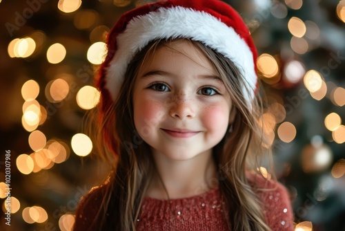 children, girl, christmas, smile, holiday, festive, tree, decoration, winter, joyful, happy, cheerful, portrait, celebration, light, bokeh, holiday season, december, tradition, red, white, cosy, warm, adorable, cute, curly hair, innocence, youth, family, love, childhood, closeup, merry, magical, seasonal, sweater, soft, glowing, beautiful, wonder, expression, face, generative, ai