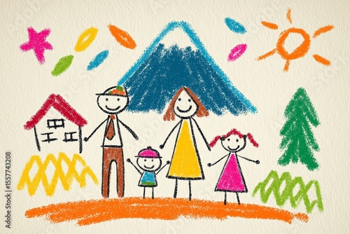 digital, illustration, wax crayons, children, stick, family, father, mother, boy, girl, house, mountain, rice, field, colourful, leaf, star, messy, playful, simple