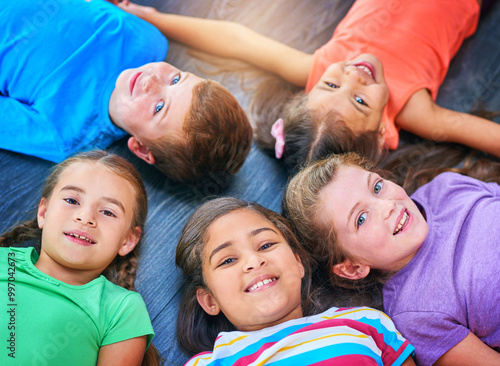 Children, circle and portrait on floor at school, above and happy for learning, bonding and development. Kids, diversity and education with huddle, friends and smile with solidarity in classroom