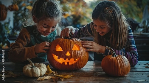 children, girl, carved, people, jack, decorate, tradition, decoration, celebrate, ritual, party, baby, november, holiday, farming, female, jack-o-lantern, childhood, helping, celebration, table, together, home, children, fall, harvesting, farm, harvest, happy, holiday, lifestyle, fun, woman, seasonal, thanksgiving, october, eltern, halloween, season, orange, autumn, family, pumpkin, children