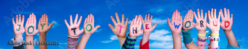 Children Hands Building Colorful English Quote Joy To The World. Blue Sky As Background