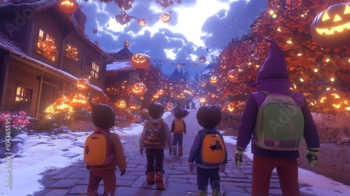 children, halloween, pumpkin, village, costume, backpack, night, decoration, autumn, tree, cloud, path, celebration, skittish, fun, community, atmosphere, adventure, joy, gathering, nature, light, scenery, friendship, exploration, creativity, holiday, excitement, landscape, culture, tradition, life events, play, warmth, magic, fantasy, shadow, colours, evening, togetherness, chill, festivity, charme, wonder, imagination, spirit, thrill, beauty