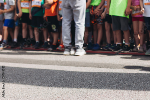 Children marathon runners crowd, young teen sportsmen participants start running in the city streets, crowd of kids joggers in motion, kid group athletes outdoor run, family competition in summer day