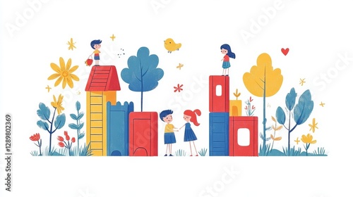 children, playful, flat, design, vector, illustration, white, flower, tree, boy, girl, playground, toy, activity, fun, happiness, summer, nature, smile, joy, creativity, interaction, friendship, playtime, animated, cheerful, vibrant, colourful, character, scene, childhood, building, adventure, cute, sunny, park, game, garden, animal, bird, environment, scenery, youthful, imagination, carefree, exploration