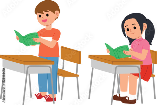 student, school, studying, book, reading, standing, desk, learning, children, cute, pupil, cognition, classroom, table, boy, girl, character, people, person, cartoon, smile, happy, young, study, notebook, class, children, friends, back to school, education, sitting, answer, element, clip art, graphic, illustration