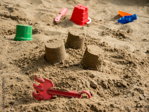 yellow, red, plastic, small, tiny, paddle, shovel, trowel, rake, bucket, sand, sandbox, children, children, baby, game, play, toy, yard, side, view