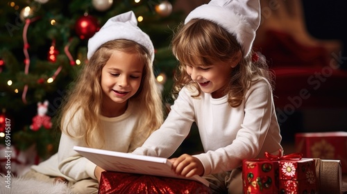 Children unwrapping Christmas gifts at home festive background. Child opening Present next to decorated Xmas Tree. Boxing Day concept. Merry Christmas and Happy Holidays! .