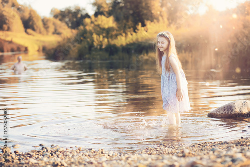 Children walk in the park in autumn. Child outdoors on a sunny summer morning in the park.