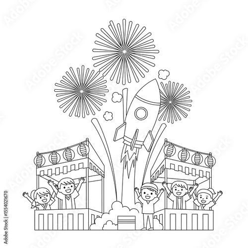 children, rocket, launch, fireworks, celebration, festival, event, spectacle, excitement, joy, happiness, childhood, illustration, drawing, outline, black-and-white, cartoon, space, outer space, travel, adventure, discovery, night sky, sky, celebratory, festive, gathering, viewing, watching, spectator, lantern, traditional