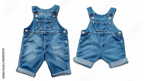 childrens fashionable light blue denim overalls shorts isolated on a white background closeup front and back view : Generative AI