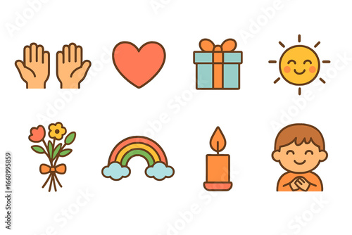children, gratitude, icon, flat, vector, mini, illustration, colours, open, hand, nubes, gift, box, smiling, sun, flower, bouquet, rainbow, candle, flames, thankful, children, design, designed, all