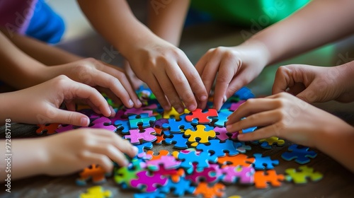Children's Hands Working Together to Complete a Colorful Puzzle