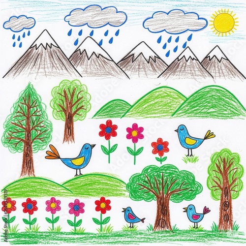 children, drawing, wax crayons, nature, landscape, mountain, tree, bird, flower, cloud, rain, sun, season, spring, summer, weather, wildlife, animal, plant, leaf, green, blue, yellow, red, purple, sky, hill, cute