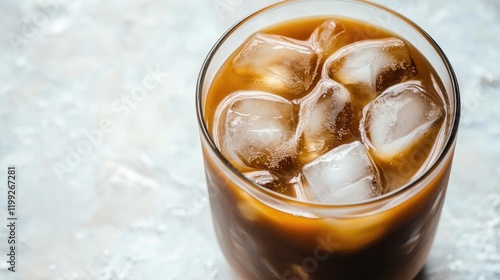 Chilled drink filled with ice cubes, showcasing refreshing textu