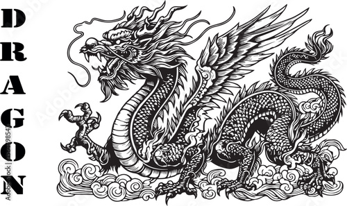 dragon, china, animal, tattoo, illustration, vector, art, ancient, fantasy, asia, design, decoration, symbol, pattern, snake, culture, gold, year, seahorse, oriental, mythology, wild, sea